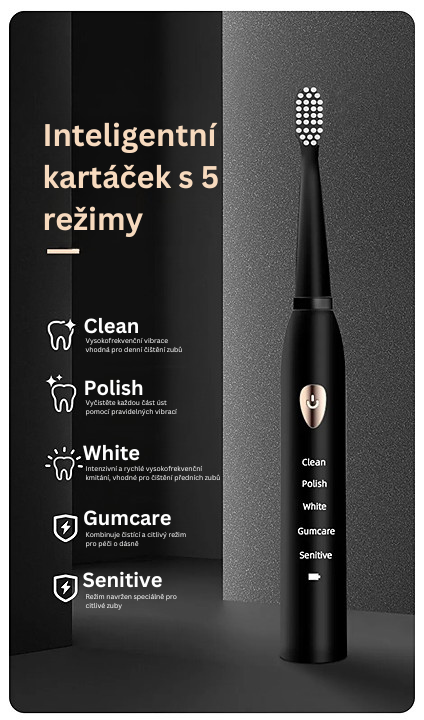 S naším špičkovým kartáčkem máte k dispozici 5 režimů pro účinnou péči o zuby. Zvolte Clean pro každodenní důkladné čištění. Polish zajišťuje intenzivní čištění a lesk. White je ideální pro bělení zubů. Gumcare kombinuje čistící a citlivý režim. Sensitive je pro citlivé zuby. S naším kartáčkem můžete snadno přepínat mezi těmito režimy a zajistit si tak maximální flexibilitu.