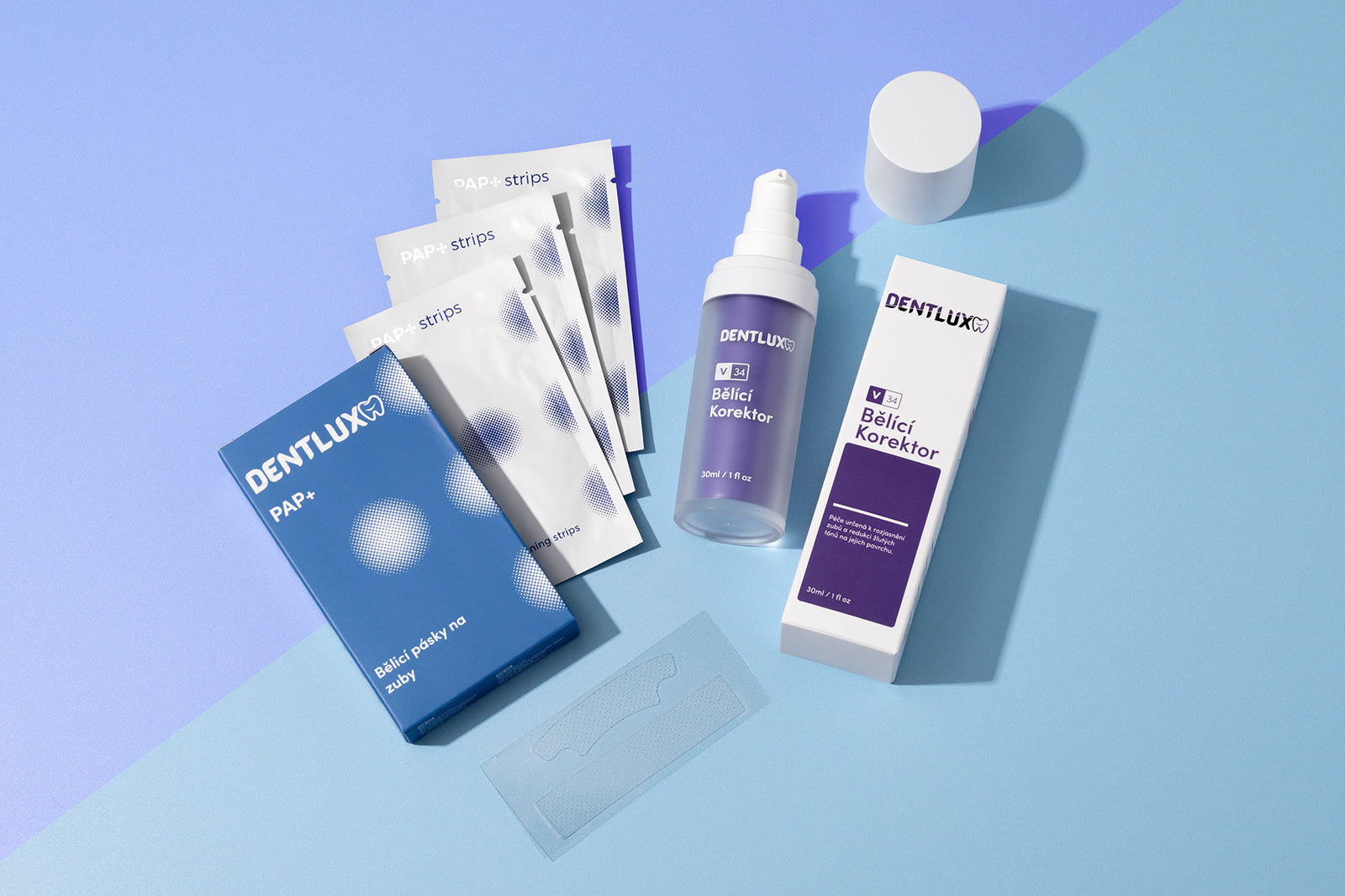 Dentlux PAP+ Bělící pásky na zuby + V34 Bělící Korektor + 4 nanokartáčky zdarma